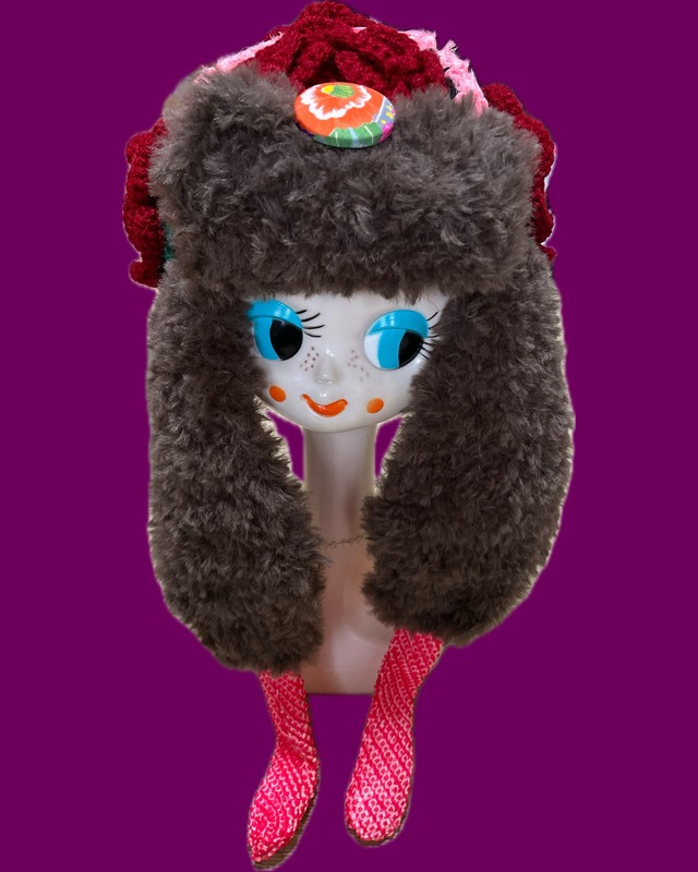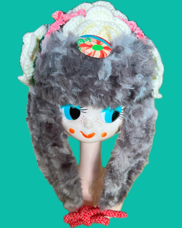 フリーサイズ 上で結んでも垂らしても可愛い帽子です。 ヴィンテージ着物の古布やパーツが使ってあります。