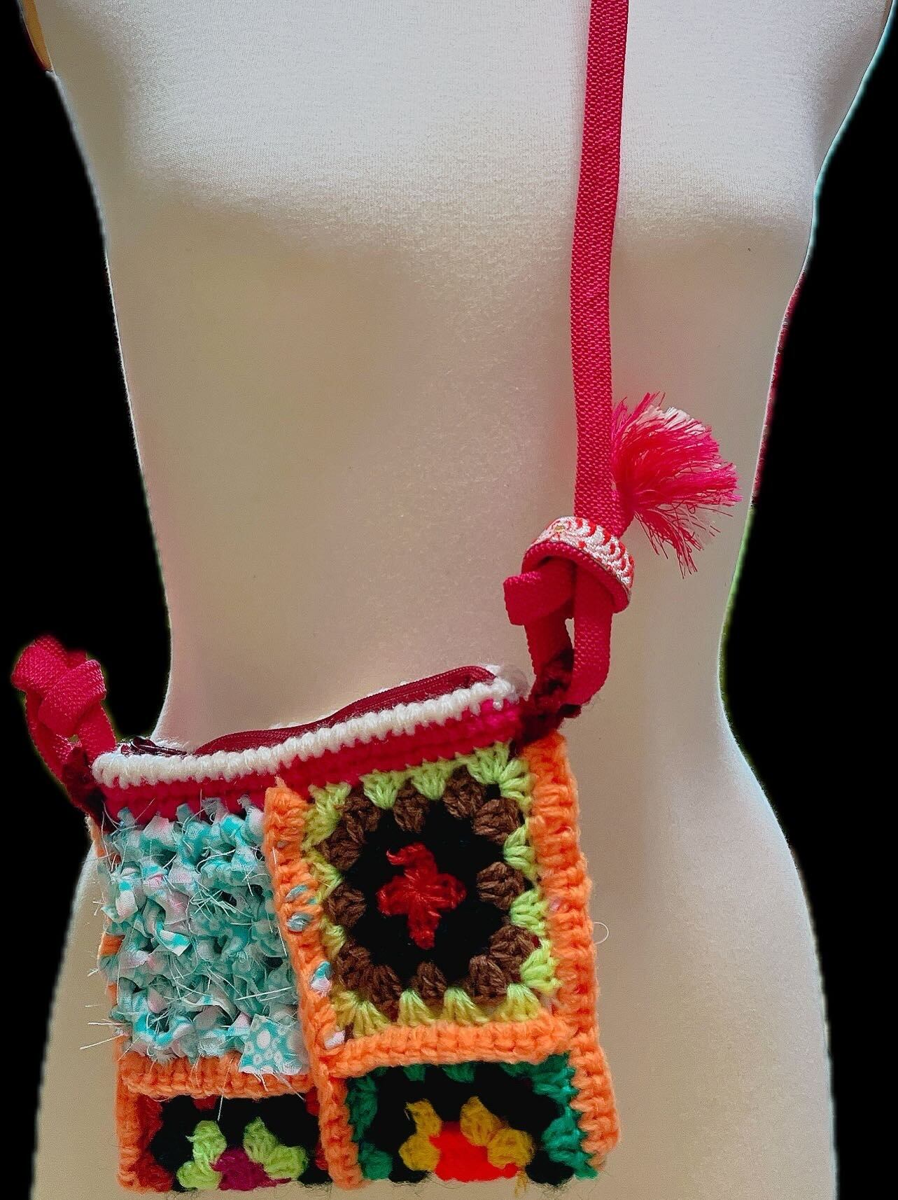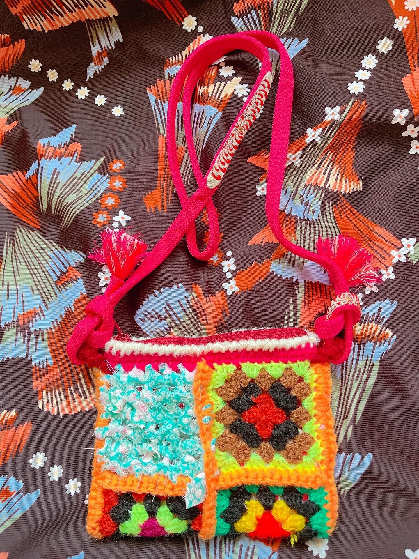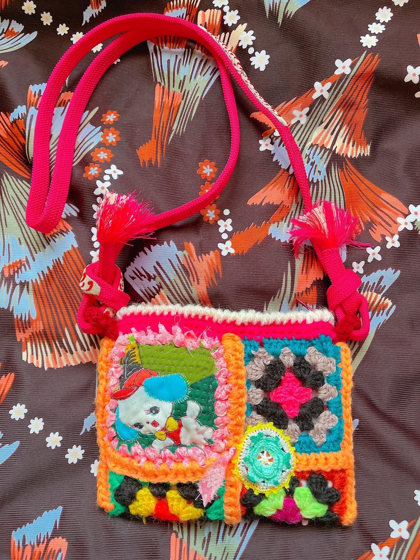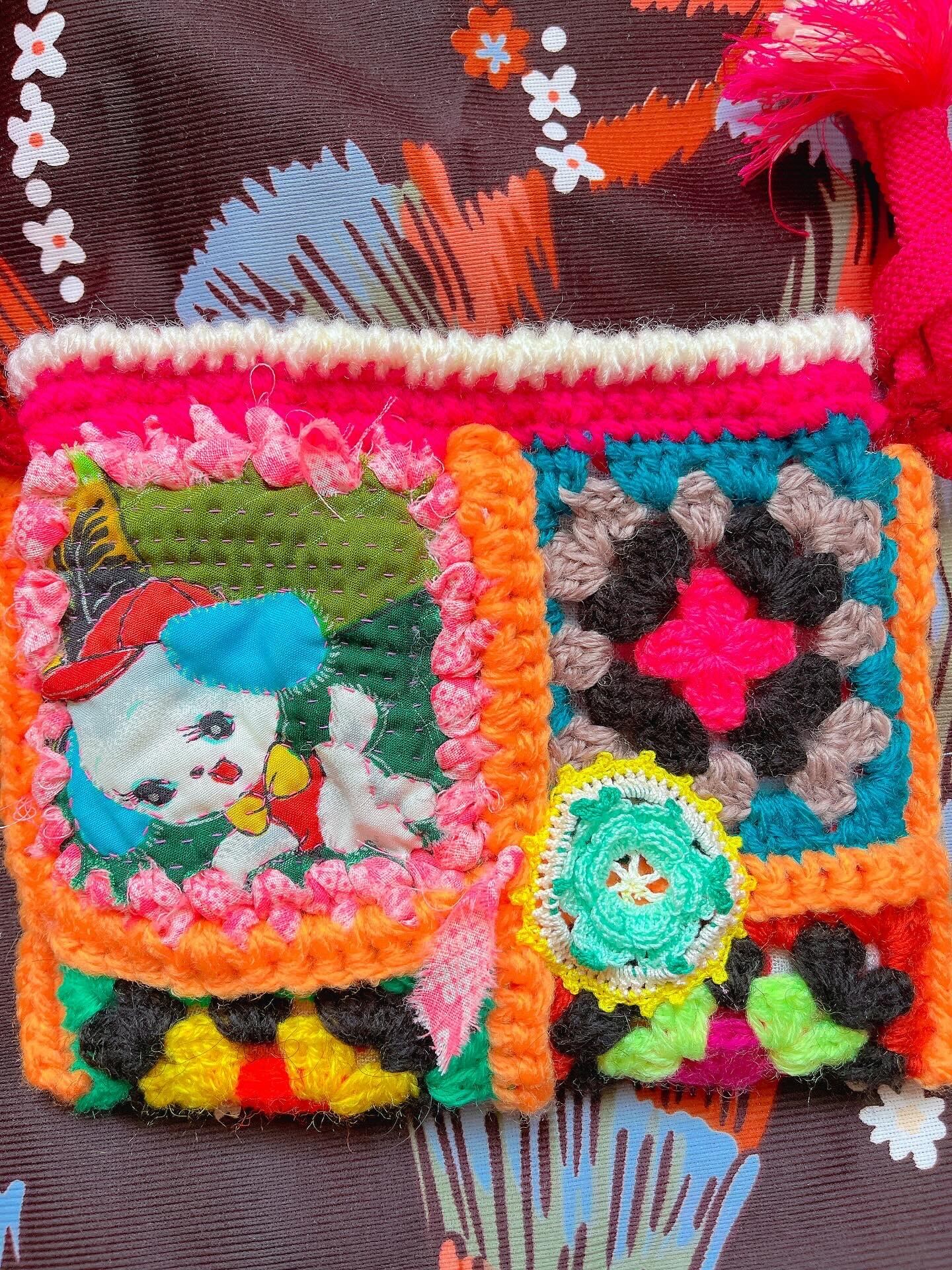 ヴィンテージの着物の古布や帯締めが使ってあります。