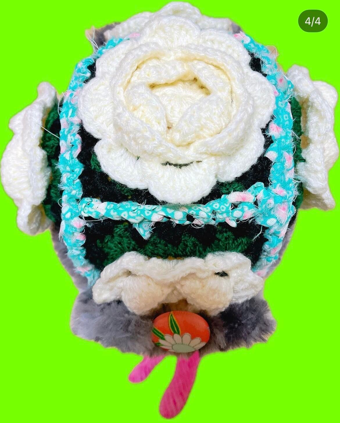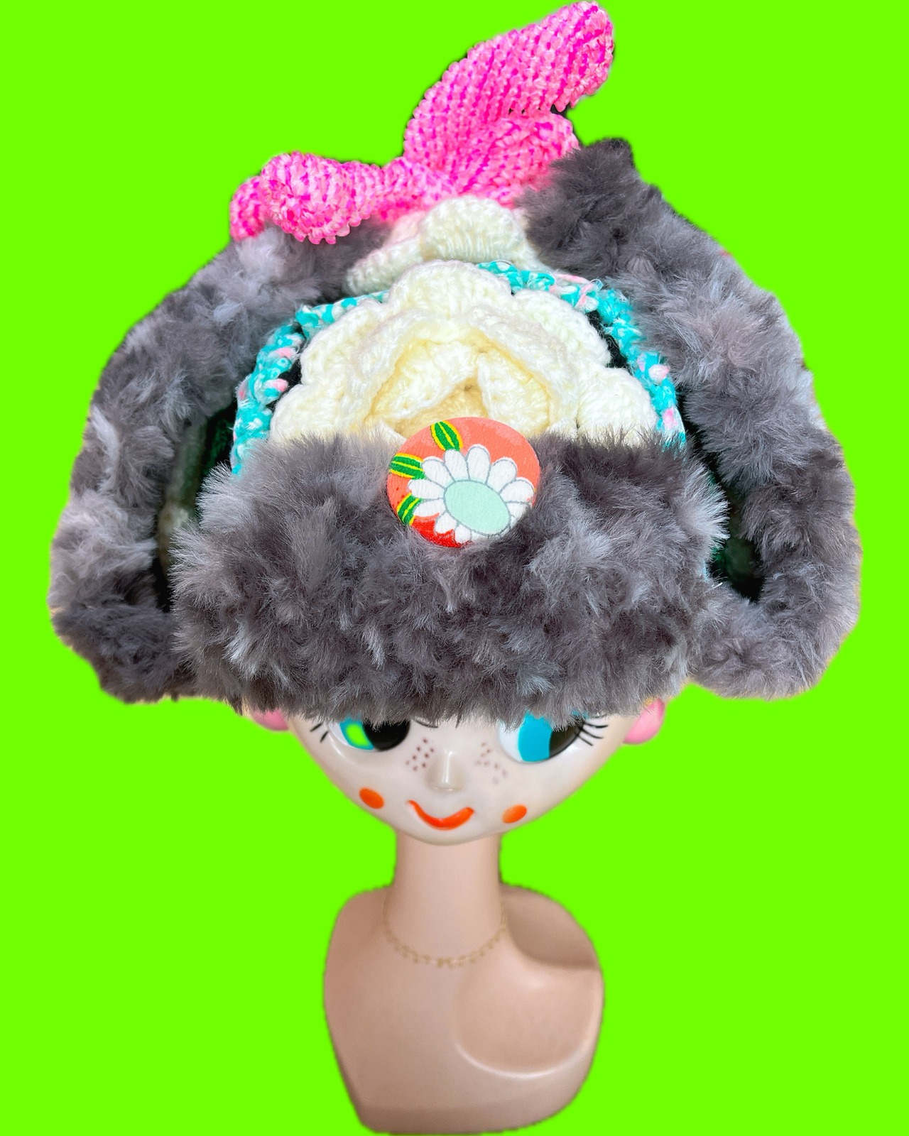 上で結んでも垂らしても可愛い帽子です。