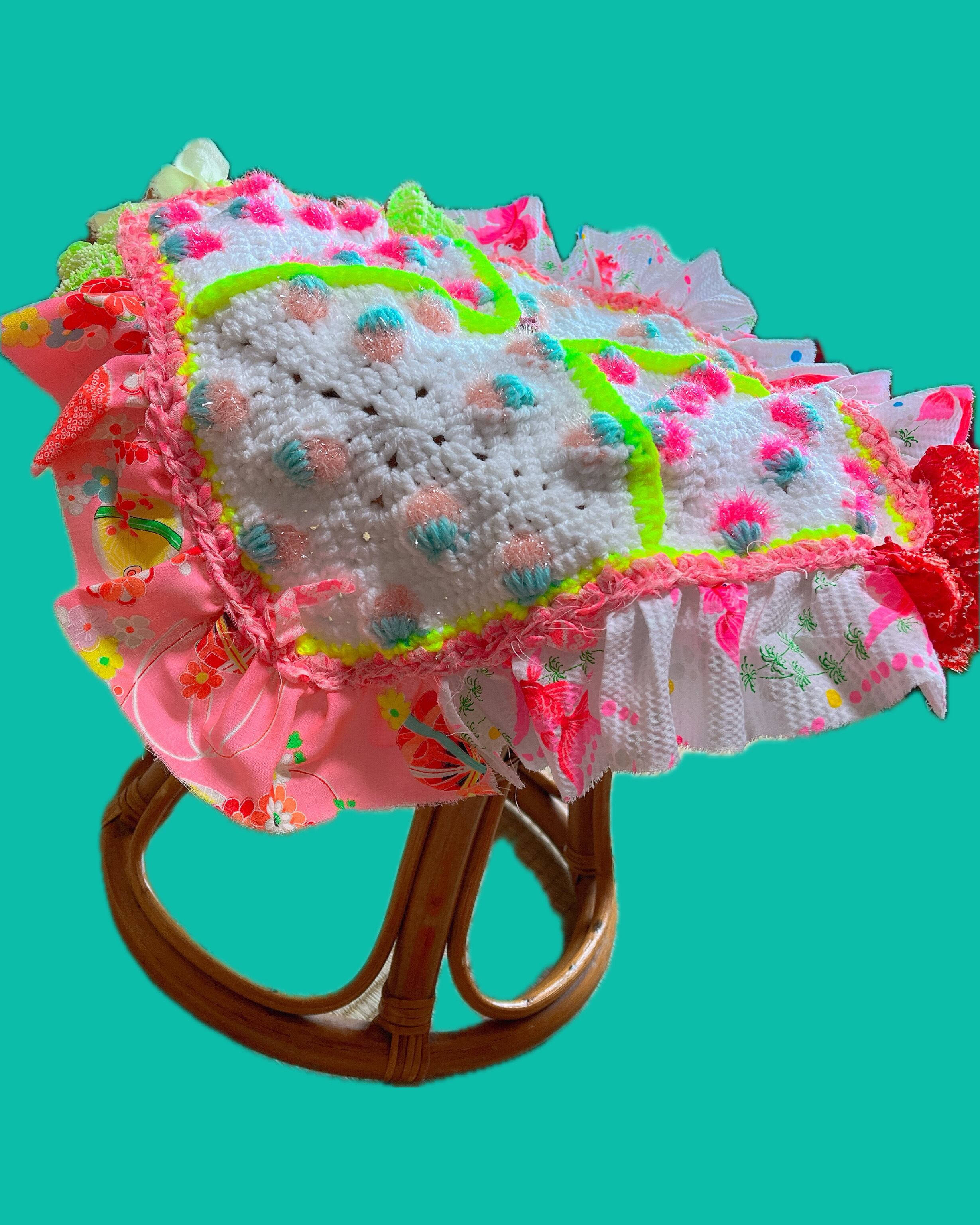 イチゴ編みのグラニースクエアに、ヴィンテージの古布が豪華に使ってあります。