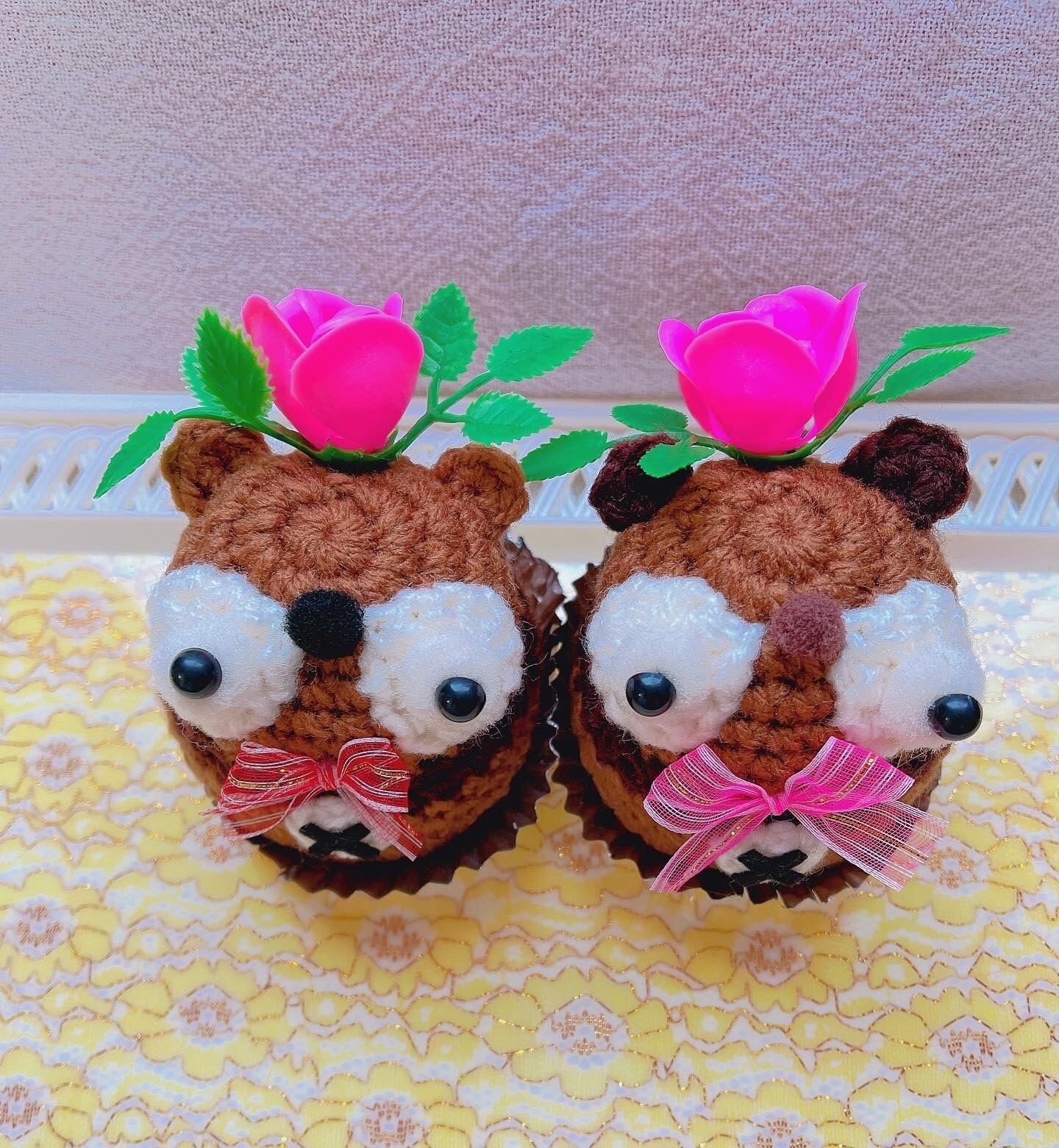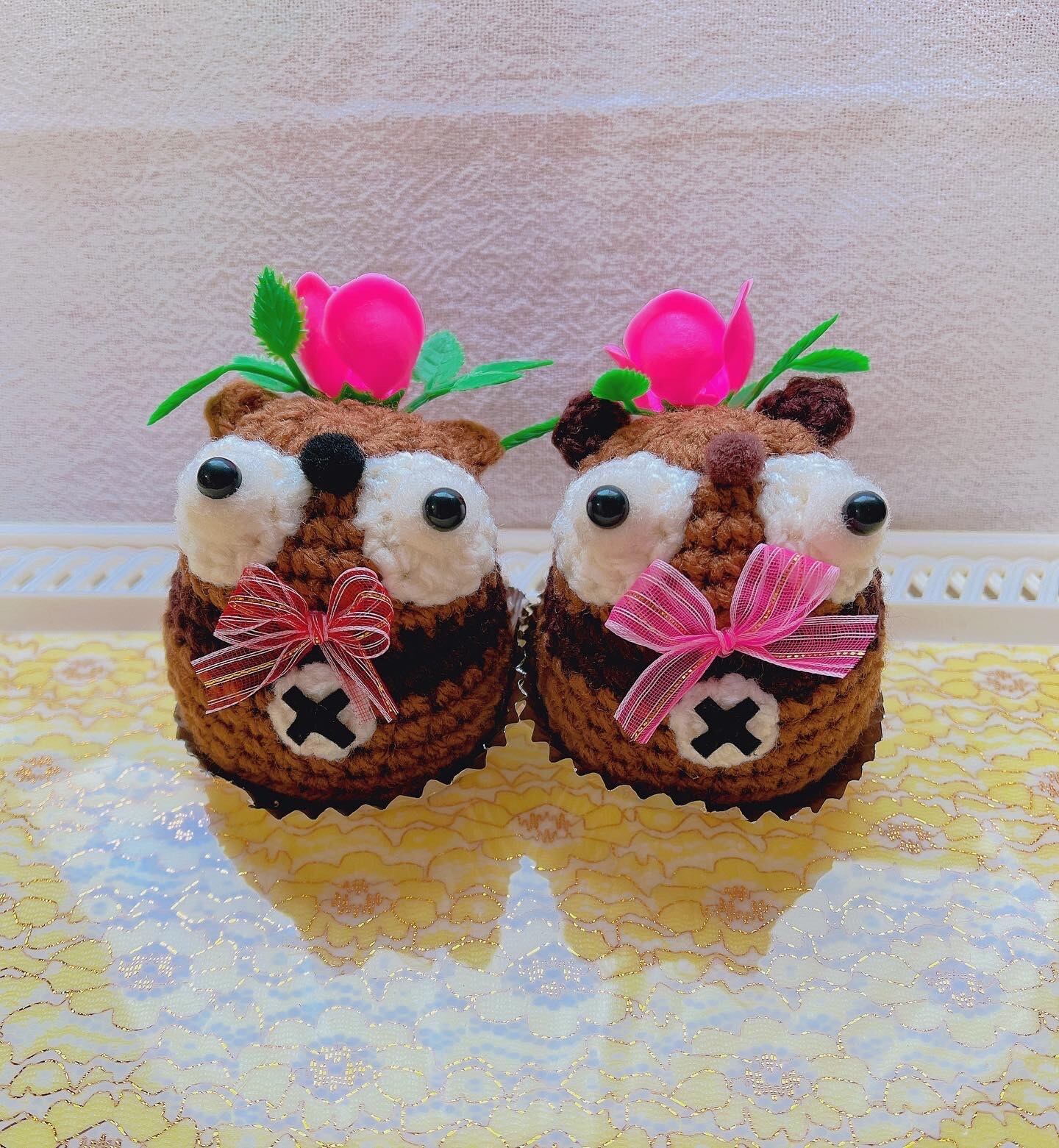 キュートなたぬきケーキのあみぐるみちゃんです。