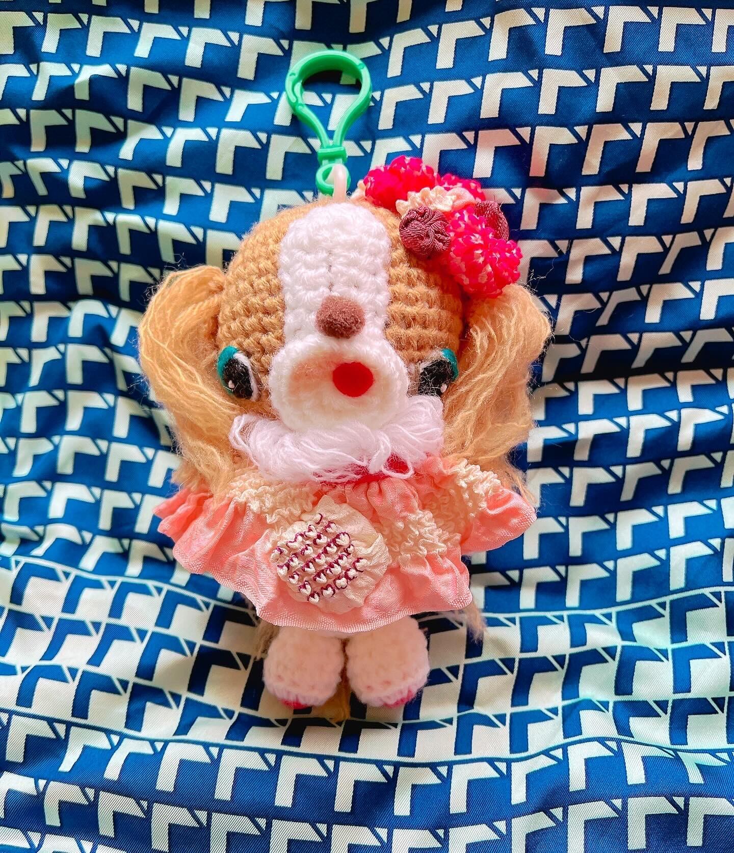 前掛けと髪飾りはヴィンテージの着物小物をリメイクして作ってあります。